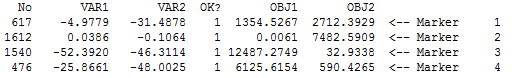 Pareto front does not give a single solution to the optimization problem, but it provides the designer with a set of potentially optimal solutions. By studying the Pareto front, the designer can choose designs that suits his needs. By holding the CTRL key and clicking on a point, you can set a marker, and see where this points appears in the 'variable' or 'objective' space.