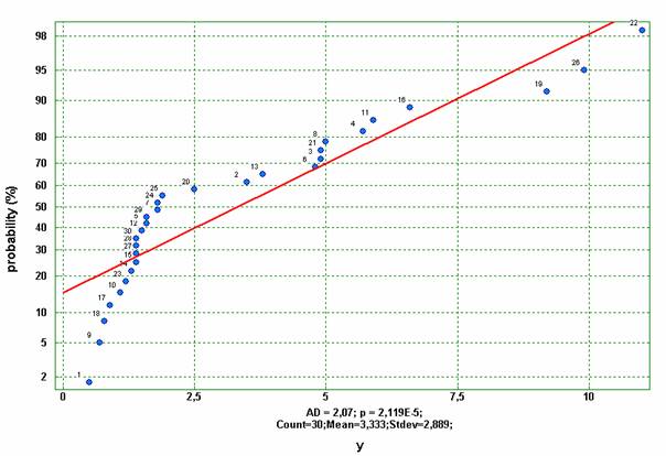 Many of the statistical methods are based on the assumption for normality of observations. In QSTATLAB this assumption is tested through the Anderson-Darling method. It uses so called normal probability plots to compare the data with the theoretical distribution. The scale of this plot is so chosen that if the data are normally distributed they are arranged on a straight line on the plot.