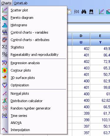 The program for time series analysis is activated by the icon or from the menu “Charts”. After column selection click OK and time series will appear on the screen. Figure below shows time series for voltage and strength. By comparing them we observe that the weld strength decreases with the growth of voltage. This can probably be explained with increasing oxidation for higher voltage processes.