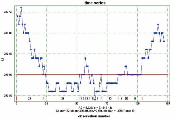 The numbers above the horizontal axis of the plot show the number of observations in corresponding runs. Looking at the time series of the voltage we can see that the first run has 21 observations, followed by three runs with 1 observation each, the next run has 27 observations, etc.