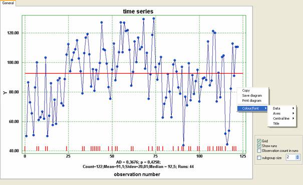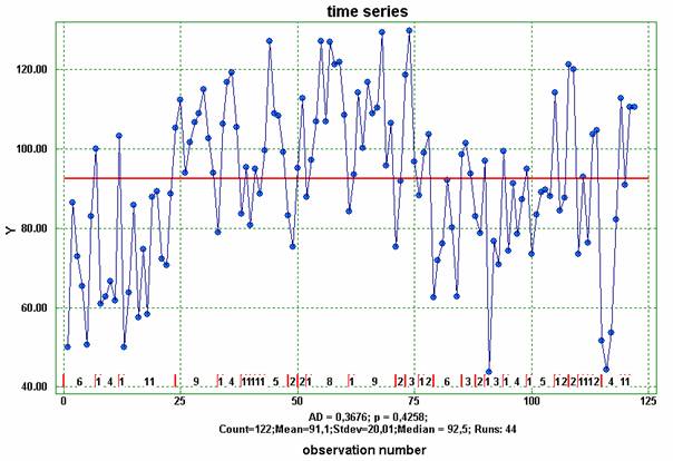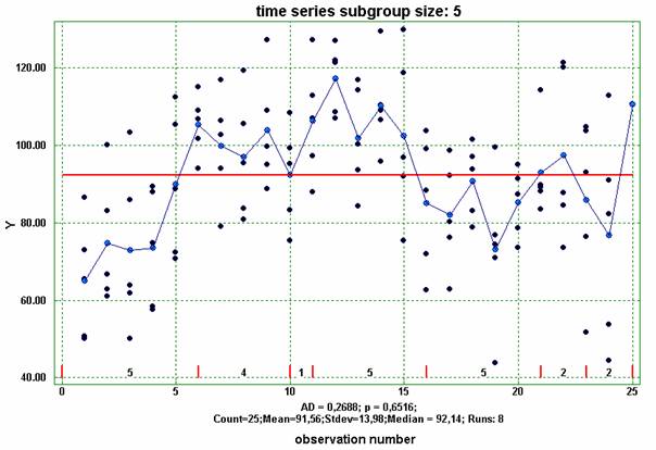 Note that the observations can be arranged in groups with different number of observations. When the option “subgroup size” is not marked, then the observations will not be grouped. The figure above shows other form of the time series for strength of the weld tear where the number of observations in runs is not given, but the runs are more clearly labelled.