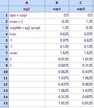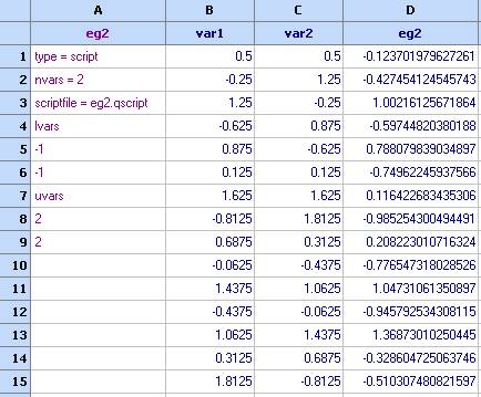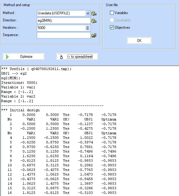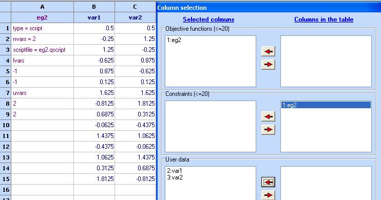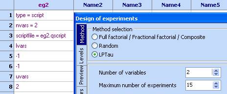 This example shows how to generate 15 DOE points and evaluate them with the eg2 function that can be found in OptimizationModels.qsl