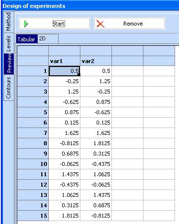2. Generate 15 LPtau designs using the DOE module. Choose LPtau in the ‘Method’ section, and specify 15 in the maximum number of experiments field: